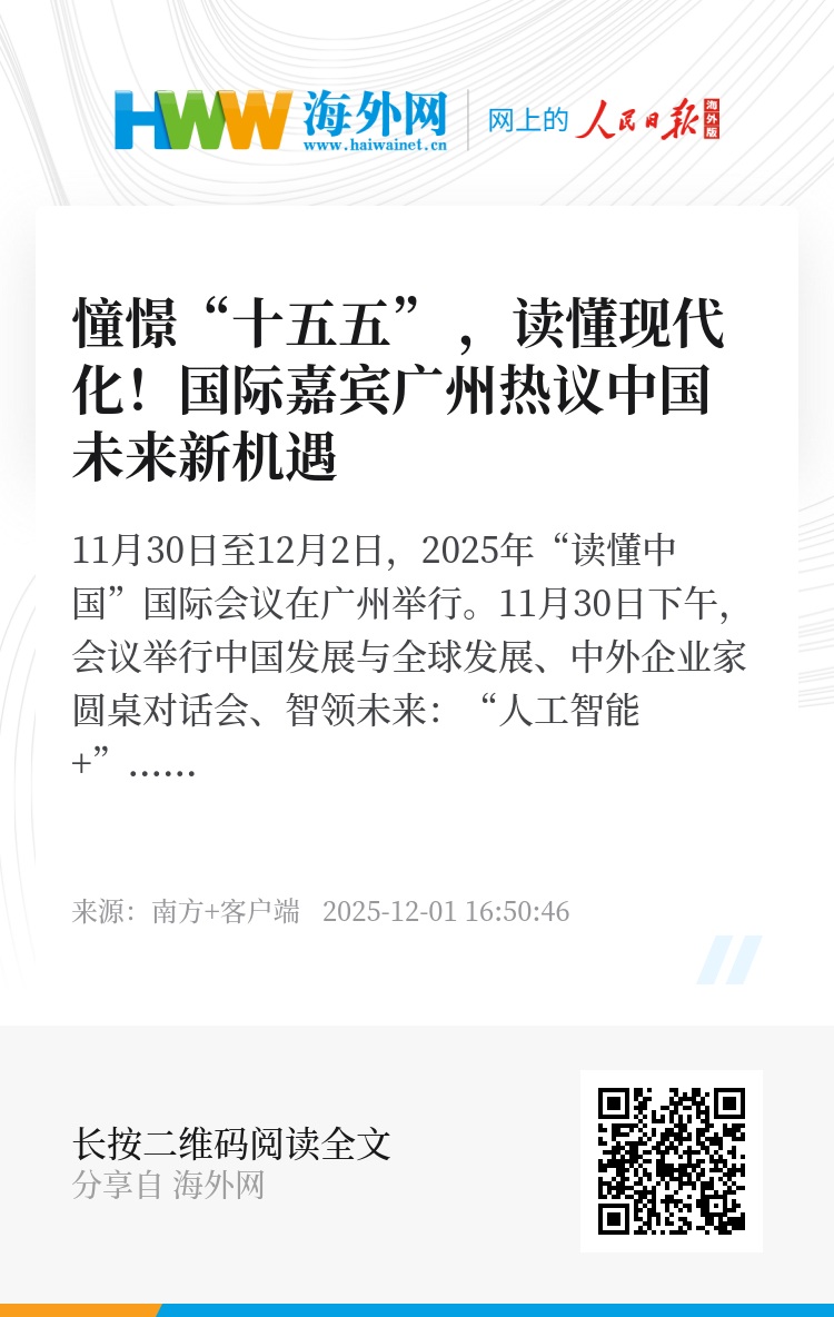 11月30日至12月2日,2025年“读懂中国”国际会议在广州举行。11月30日下午,会议举行中国发展与全球发展、中外企业家圆桌对话会、智领未来:“人工智能+”背景下“十五五”产业升级与人才培养等11个专题论坛,与会嘉宾纷纷表示,中国与世界发展有着“双赢”的内在逻辑,这是“十五五”规划引发全球关注的深层原因。