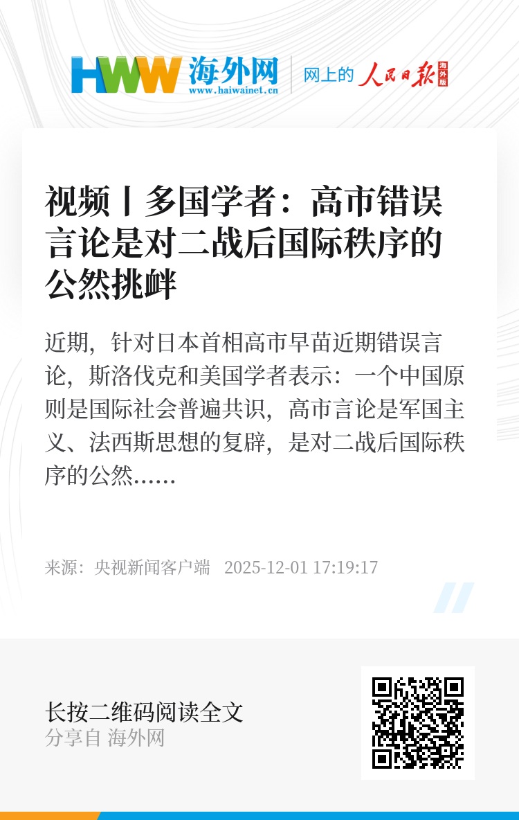 近期,针对日本首相高市早苗近期错误言论,斯洛伐克和美国学者表示:一个中国原则是国际社会普遍共识,高市言论是军国主义、法西斯思想的复辟,是对二战后国际秩序的公然挑衅。