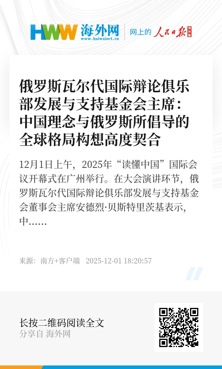 12月1日上午,2025年“读懂中国”国际会议开幕式在广州举行。在大会演讲环节,俄罗斯瓦尔代国际辩论俱乐部发展与支持基金会董事会主席安德烈·贝斯特里茨基表示,中国式现代化的一个关键特征,是其已崛起为具有关键影响力的全球性大国。国内发展所取得的卓越成就,为其拓展国际影响力铺平了道路,使中国得以凭借自身的行动议程与独特发展模式,为推动人类共同发展发挥建设性作用。