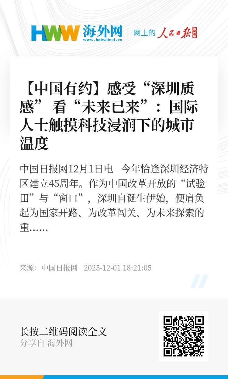 中国日报网12月1日电 今年恰逢深圳经济特区建立45周年。作为中国改革开放的“试验田”与“窗口”,深圳自诞生伊始,便肩负起为国家开路、为改革闯关、为未来探索的重大历史使命。11月26日至28日,2025“中国有约”国际媒体采访团走进深圳,开启了一场探寻这座城市创新魅力与蓬勃活力的精彩之旅。