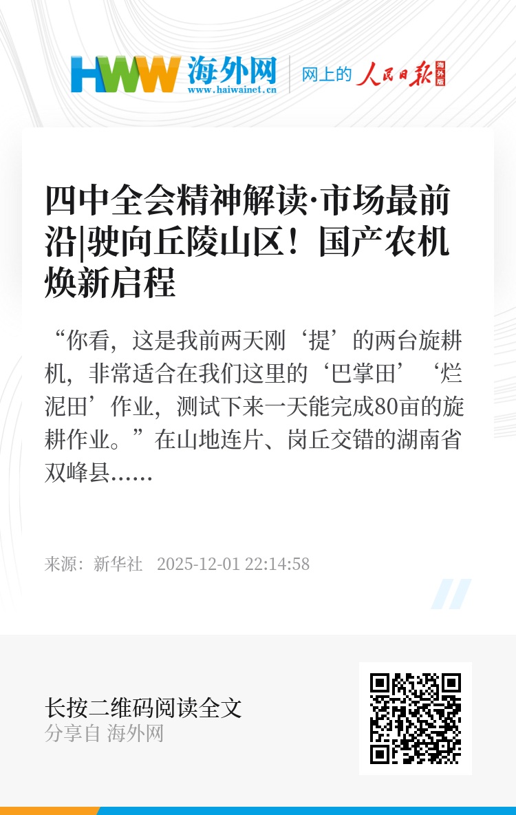 突破更多使用场景,提升更多工作性能……“十五五”新程将启,随着来自政策、科技、产业等各方面力量聚集,国产农机将焕新出发,在丘陵山区更好发挥作用。(记者古一平、谢奔、许舜达)