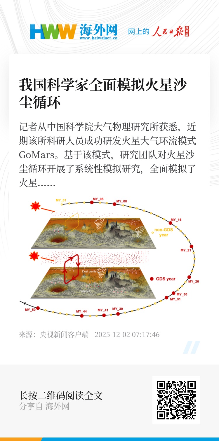 记者从中国科学院大气物理研究所获悉,近期该所科研人员成功研发火星大气环流模式GoMars。基于该模式,研究团队对火星沙尘循环开展了系统性模拟研究,全面模拟了火星沙尘循环,重点展示了沙尘循环的多时间尺度变率,并成功模拟了其中最具挑战的年际变率,这是火星大气模拟公认的难点之一。此外,该研究有效评估了GoMars的模拟性能,为未来实现可靠的火星天气预报与气候预测奠定了关键基础。相关研究成果已在学术期刊《大气科学进展》发表。