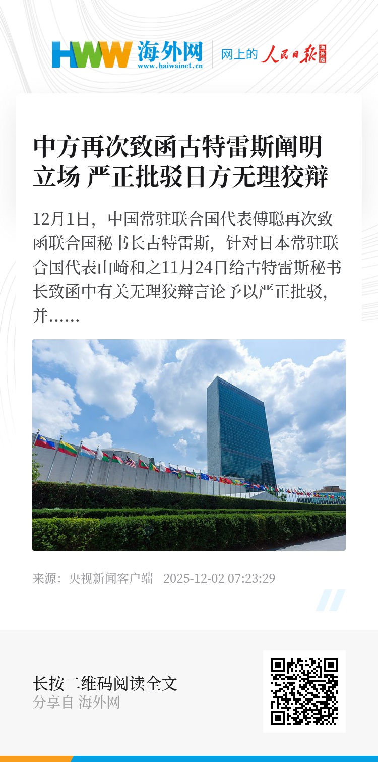 我日前向你致函表达中国政府对于日本首相高市早苗涉台挑衅性言论的严正关切。中方注意到,日本常驻代表于11月24日给你写信进行无理狡辩,回避关键问题,对中方无端指责、倒打一耙,中方对此坚决反对。我奉政府指示进一步阐明立场如下: