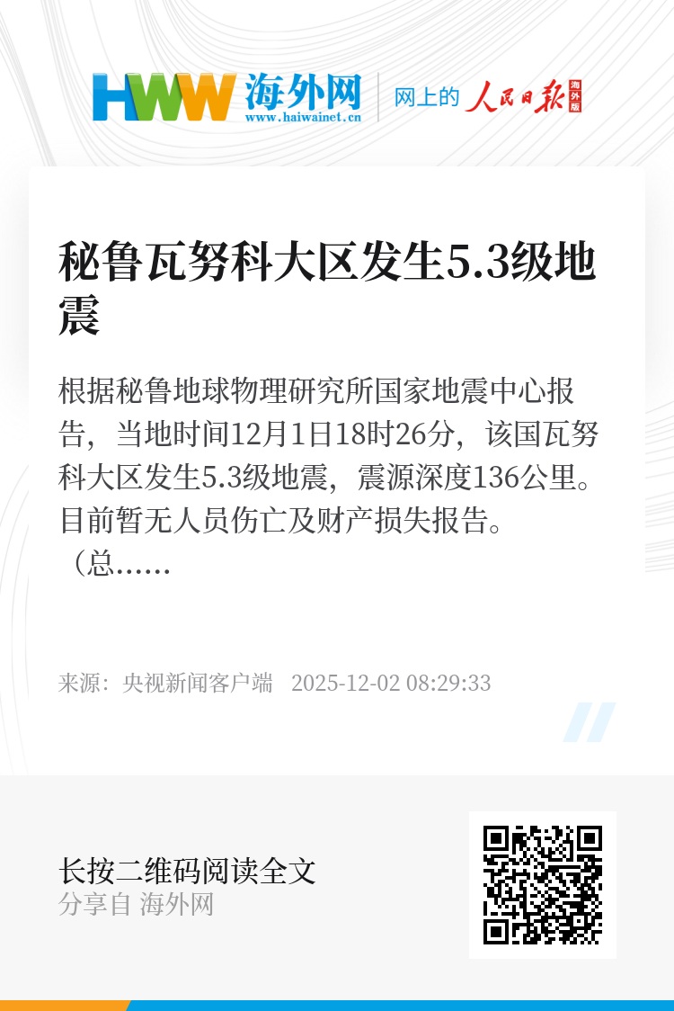 根据秘鲁地球物理研究所国家地震中心报告,当地时间12月1日18时26分,该国瓦努科大区发生5.3级地震,震源深度136公里。目前暂无人员伤亡及财产损失报告。(总台记者 王璐璐 马天静)