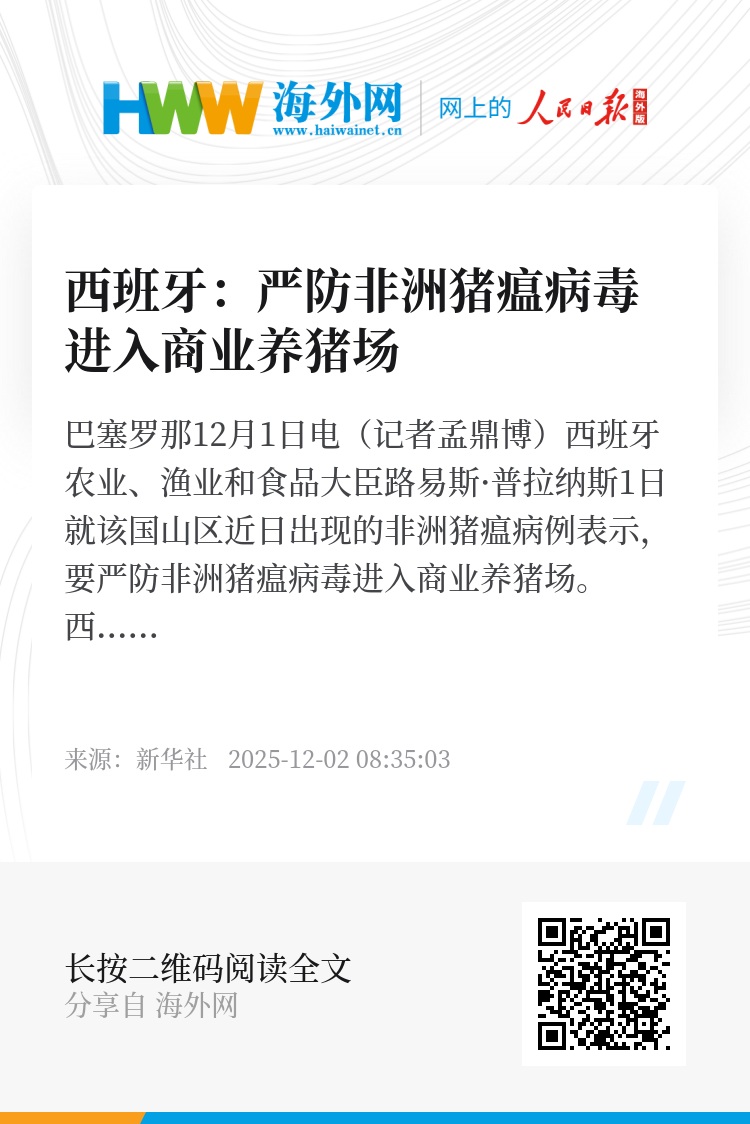 新华社巴塞罗那12月1日电(记者孟鼎博)西班牙农业、渔业和食品大臣路易斯·普拉纳斯1日就该国山区近日出现的非洲猪瘟病例表示,要严防非洲猪瘟病毒进入商业养猪场。