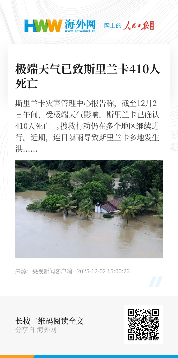 斯里兰卡灾害管理中心报告称,截至12月2日午间,受极端天气影响,斯里兰卡已确认410人死亡 。搜救行动仍在多个地区继续进行。