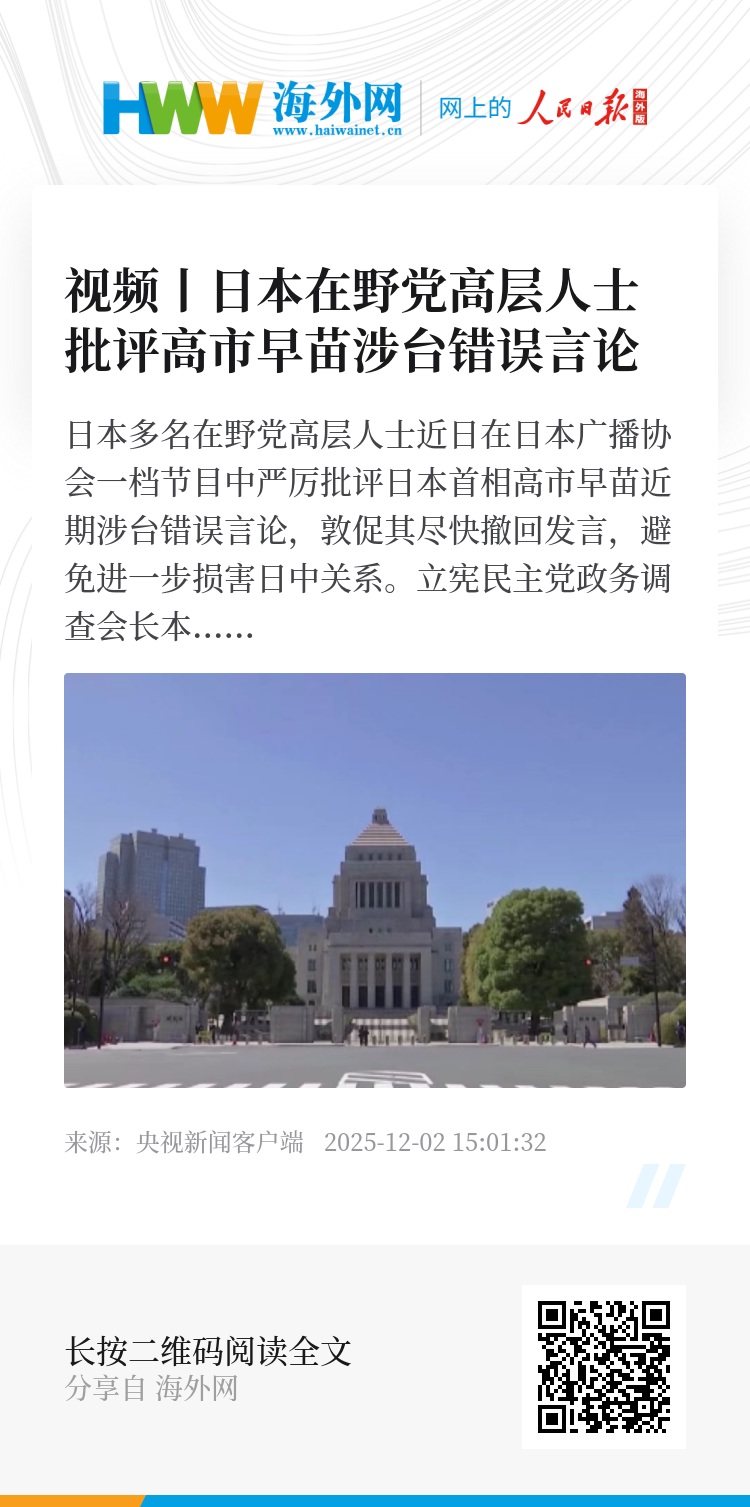 日本多名在野党高层人士近日在日本广播协会一档节目中严厉批评日本首相高市早苗近期涉台错误言论,敦促其尽快撤回发言,避免进一步损害日中关系。