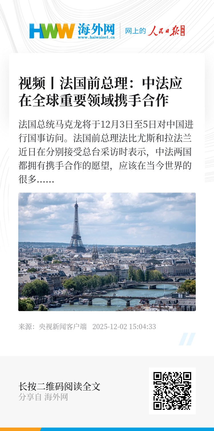 法国总统马克龙将于12月3日至5日对中国进行国事访问。法国前总理法比尤斯和拉法兰近日在分别接受总台采访时表示,中法两国都拥有携手合作的愿望,应该在当今世界的很多重要领域开展合作。