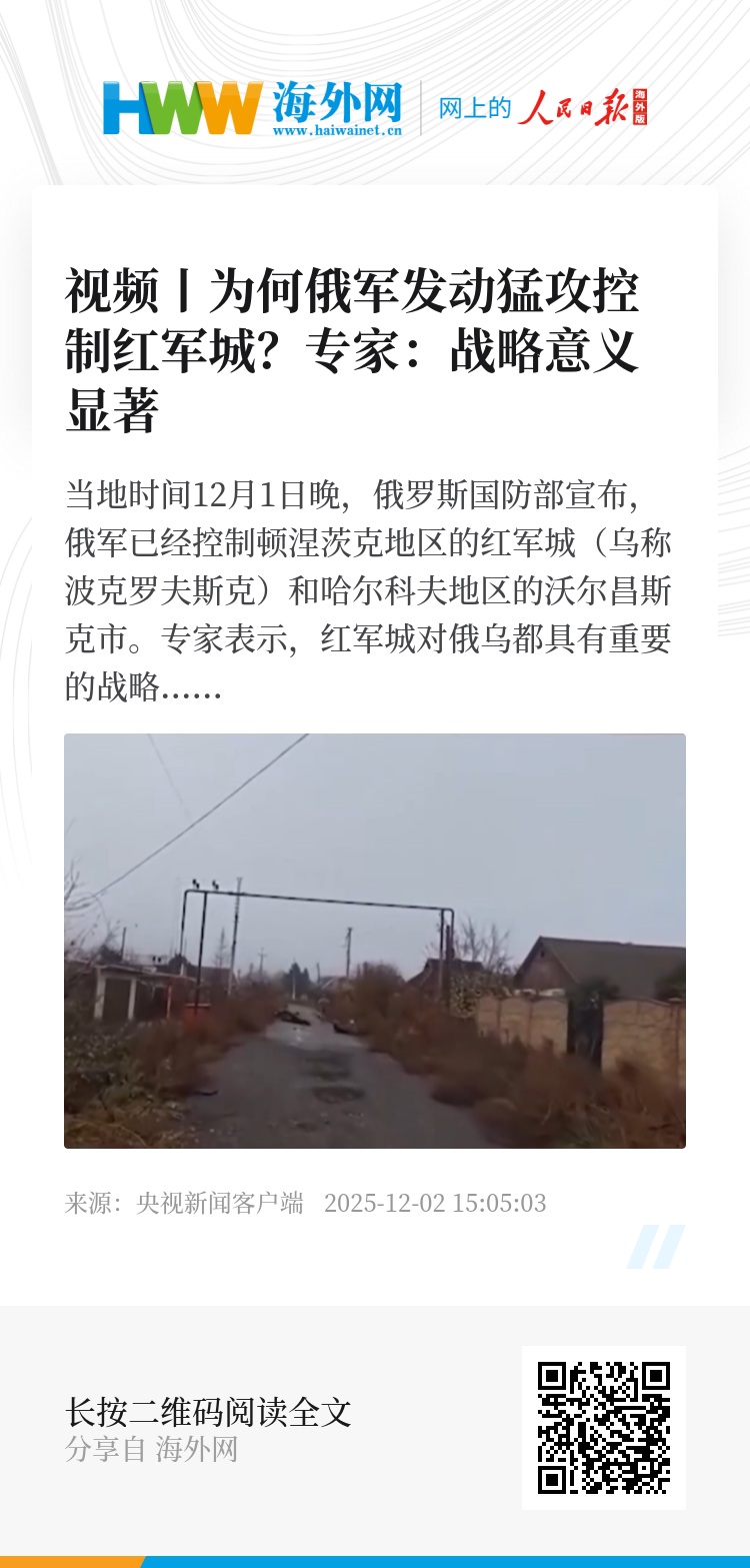 当地时间12月1日晚,俄罗斯国防部宣布,俄军已经控制顿涅茨克地区的红军城(乌称波克罗夫斯克)和哈尔科夫地区的沃尔昌斯克市。