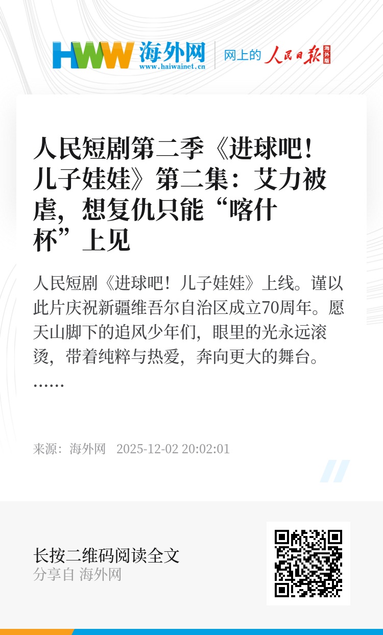 人民短剧《进球吧!儿子娃娃》上线。谨以此片庆祝新疆维吾尔自治区成立70周年。愿天山脚下的追风少年们,眼里的光永远滚烫,带着纯粹与热爱,奔向更大的舞台。