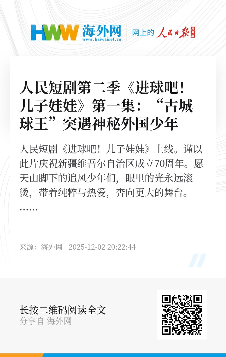 人民短剧《进球吧!儿子娃娃》上线。谨以此片庆祝新疆维吾尔自治区成立70周年。愿天山脚下的追风少年们,眼里的光永远滚烫,带着纯粹与热爱,奔向更大的舞台。