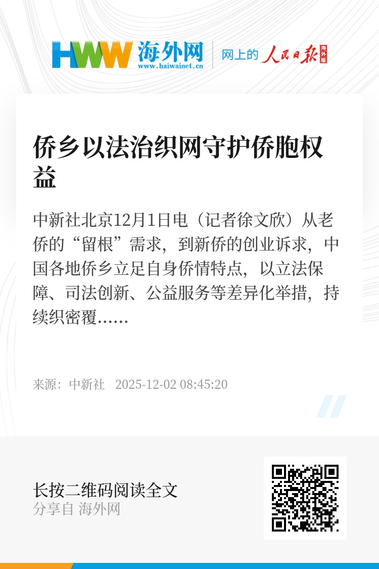 中新社北京12月1日电(记者徐文欣)从老侨的“留根”需求,到新侨的创业诉求,中国各地侨乡立足自身侨情特点,以立法保障、司法创新、公益服务等差异化举措,持续织密覆盖广、服务实的华侨权益保护网络。