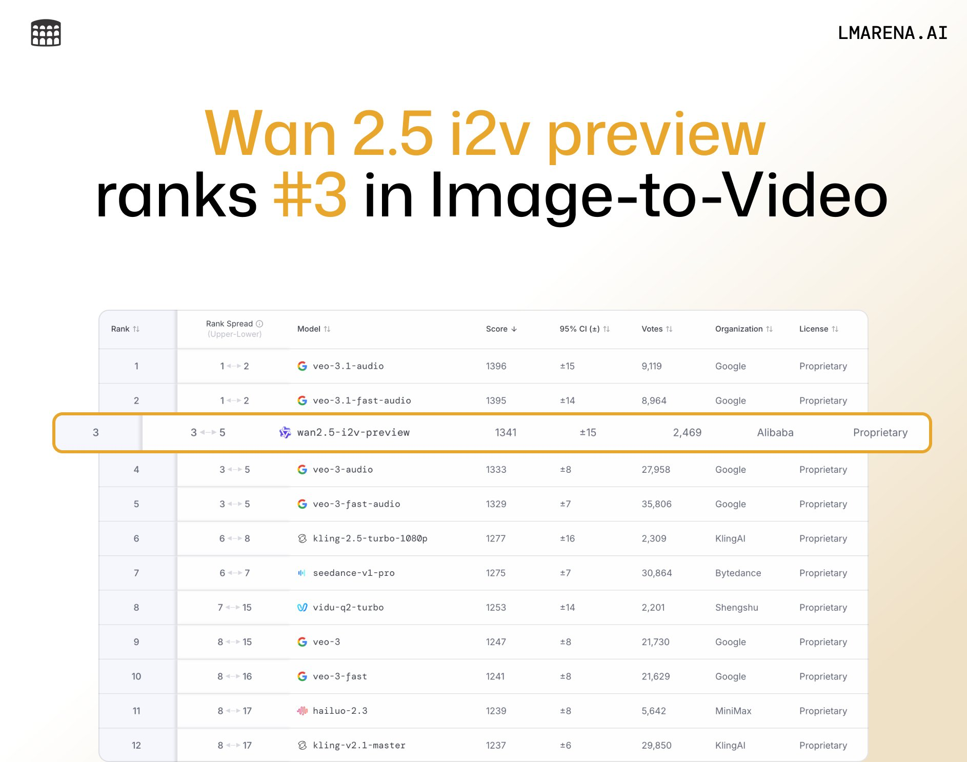 阿里万相2.5是目前业界少数具备音画同步能力的视频模型之一,该模型同时支持理解和生成等多种任务,支持文本、图像、视频、音频多种模态的输入和输出,在权威大模型评测LMArena上,万相的图生视频能力位居全球第三,稳居国内第一。