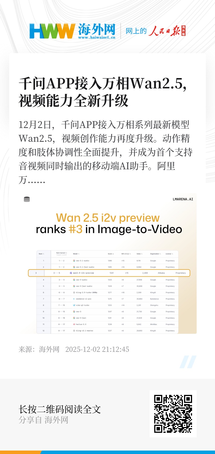 12月2日,千问APP接入万相系列最新模型Wan2.5,视频创作能力再度升级。动作精度和肢体协调性全面提升,并成为首个支持音视频同时输出的移动端AI助手。