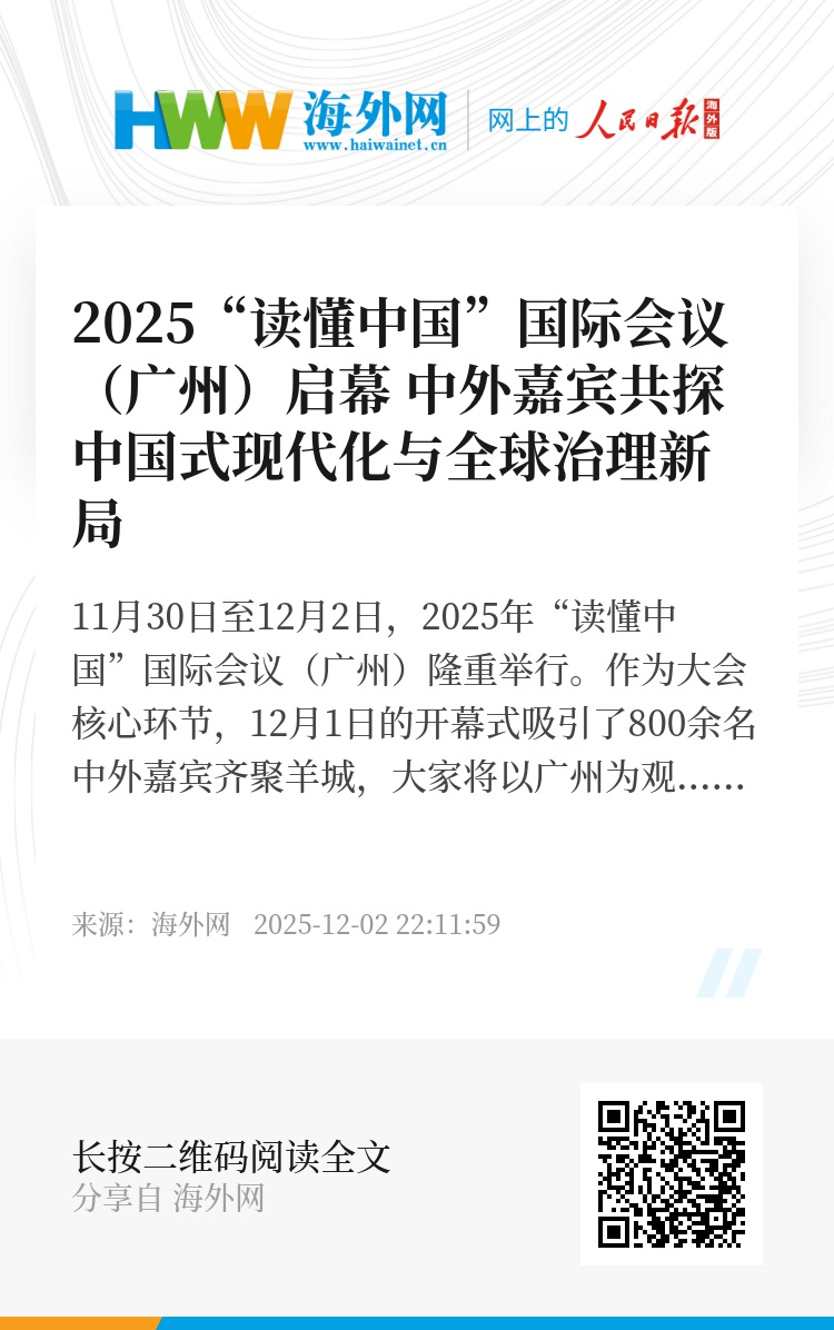 11月30日至12月2日,2025年“读懂中国”国际会议(广州)隆重举行。作为大会核心环节,12月1日的开幕式吸引了800余名中外嘉宾齐聚羊城,大家将以广州为观察窗口,全方位深入了解广东发展、感知湾区活力、读懂中国实践。