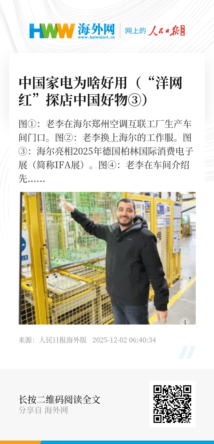 不仅自己用,老李还把中国家电推荐给了他在国外生活的家人。“要知道,阿拉伯国家的很多地方比广州还热,他们也需要好用的空调。而且海尔的产品在我的家乡也能很方便地买到。”