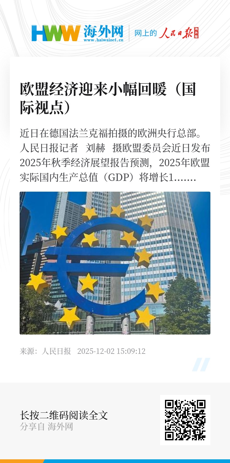 欧盟委员会近日发布2025年秋季经济展望报告预测,2025年欧盟实际国内生产总值(GDP)将增长1.4%,欧元区增长1.3%;2026年欧盟经济将增长1.4%,欧元区经济增长1.2%。另据最新数据,经季节调整后,今年第三季度欧盟GDP环比增长0.3%,同比增长1.5%;欧元区环比增长0.2%,同比增长1.3%。欧盟委员会报告认为,尽管外部环境严峻,但未来欧盟经济预计将以温和速度继续扩张。
