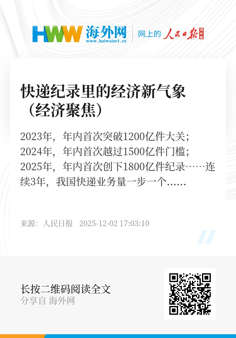 2023年,年内首次突破1200亿件大关;2024年,年内首次越过1500亿件门槛;2025年,年内首次创下1800亿件纪录……连续3年,我国快递业务量一步一个脚印、不断跃上新高度。