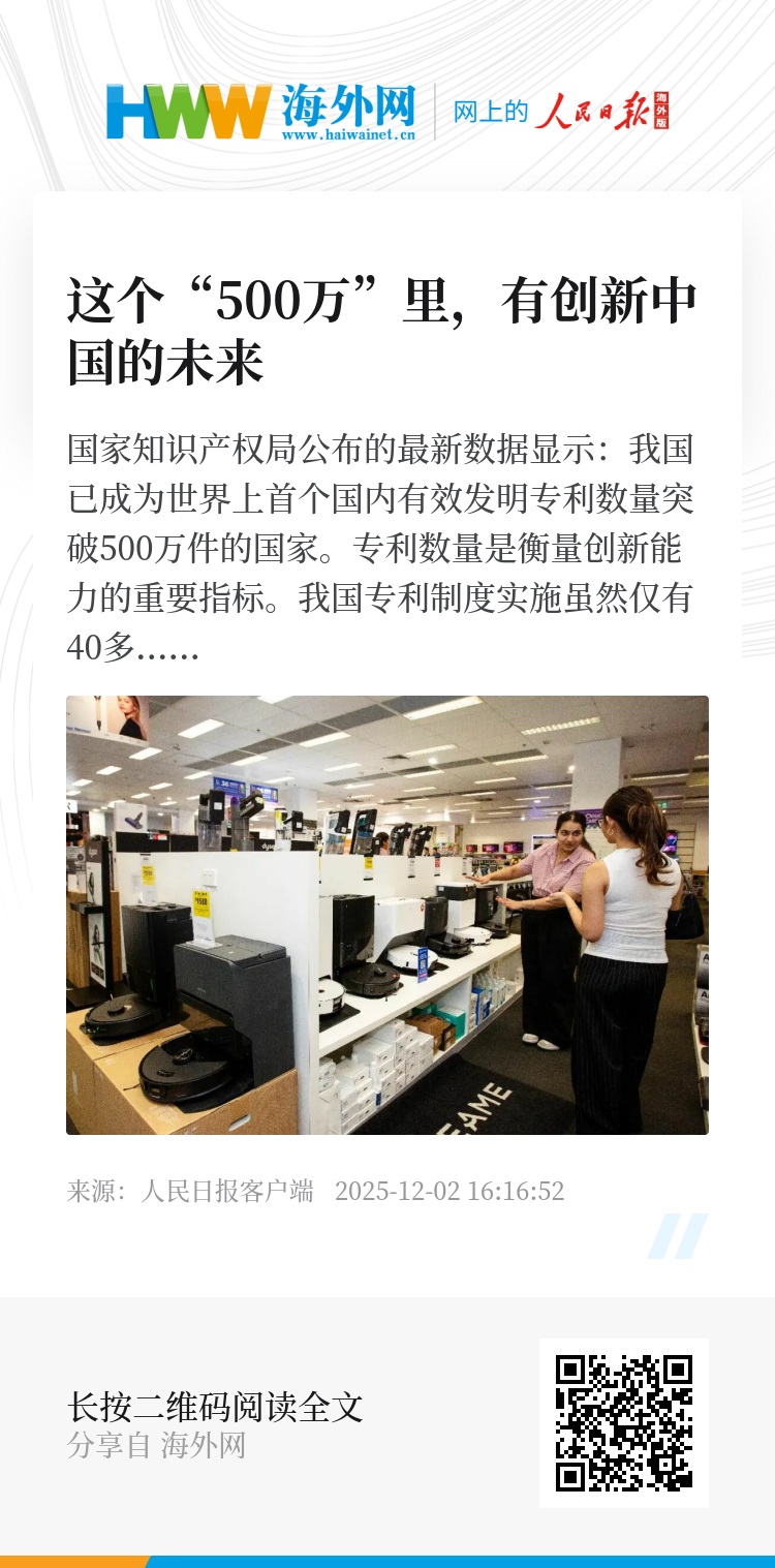 国家知识产权局公布的最新数据显示:我国已成为世界上首个国内有效发明专利数量突破500万件的国家。