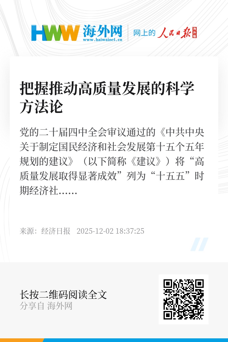 党的二十届四中全会审议通过的《中共中央关于制定国民经济和社会发展第十五个五年规划的建议》(以下简称《建议》)将“高质量发展取得显著成效”列为“十五五”时期经济社会发展的主要目标之一,并明确强调要“坚持高质量发展”。习近平总书记指出,《建议》与“十四五”规划一脉相承,继续把推动高质量发展确定为“十五五”时期经济社会发展的主题,要求坚持以经济建设为中心,完整准确全面贯彻新发展理念,实现质的有效提升和量的合理增长,推动经济持续健康发展和社会全面进步。这不仅从战略高度擘画了高质量发展蓝图,更凸显出实现高质量发展必须坚持的科学方法论,为把握发展大势、谋划发展布局提供了理论遵循和行动指南。