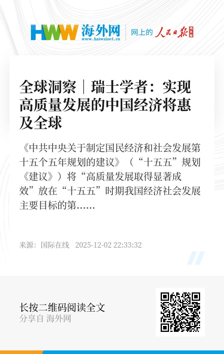 近日,瑞士日内瓦伯尔尼大区经济发展署前署长菲利普·默尼耶在接受总台环球资讯记者专访时表示,近年来,中国对经济社会发展的规划,从注重经济增长的速度,转向更加关注经济增长的质量,“十五五”规划《建议》中的相关表述,体现了中国经济政策的前瞻性和延续性,而中国经济的转型发展,具体的体现是民众福祉的提升。