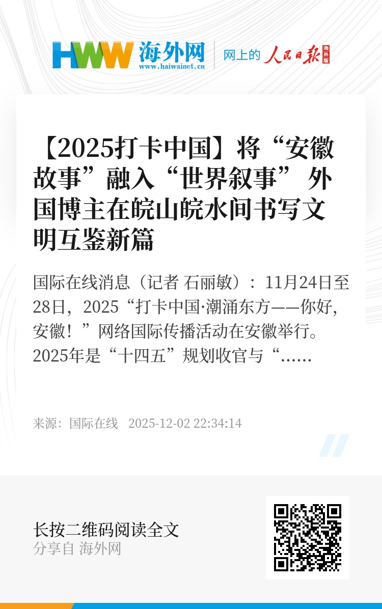 国际在线消息(记者 石丽敏):11月24日至28日,2025“打卡中国·潮涌东方——你好,安徽!”网络国际传播活动在安徽举行。