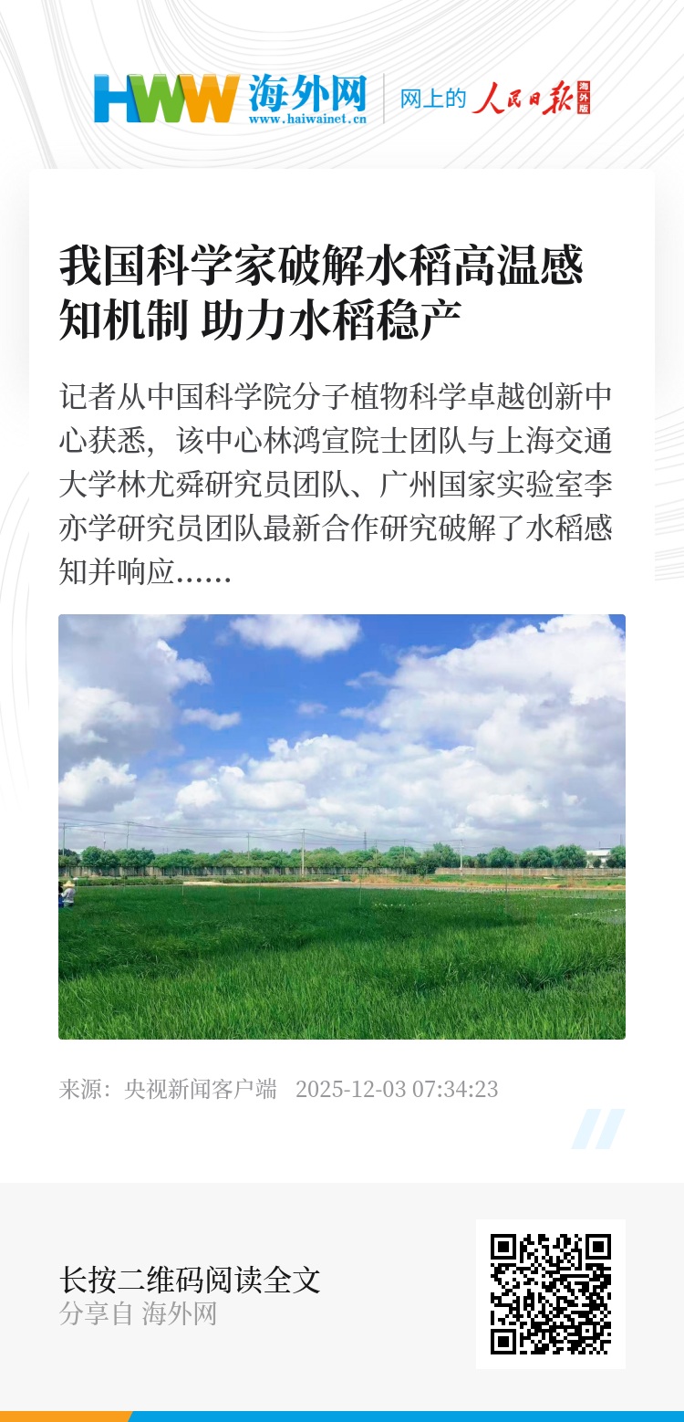 记者从中国科学院分子植物科学卓越创新中心获悉,该中心林鸿宣院士团队与上海交通大学林尤舜研究员团队、广州国家实验室李亦学研究员团队最新合作研究破解了水稻感知并响应高温的双重“密码锁”,揭示了植物中的一个循序激活、协同串联的热信号感知机制,并通过对该机制的遗传改良,成功培育出具有梯度耐热性的水稻新株系,助力作物耐高温分子育种,为应对全球变暖导致的粮食减产提供了新的解决方案。相关研究成果北京时间2025年12月3日在国际学术期刊《细胞》发表。
