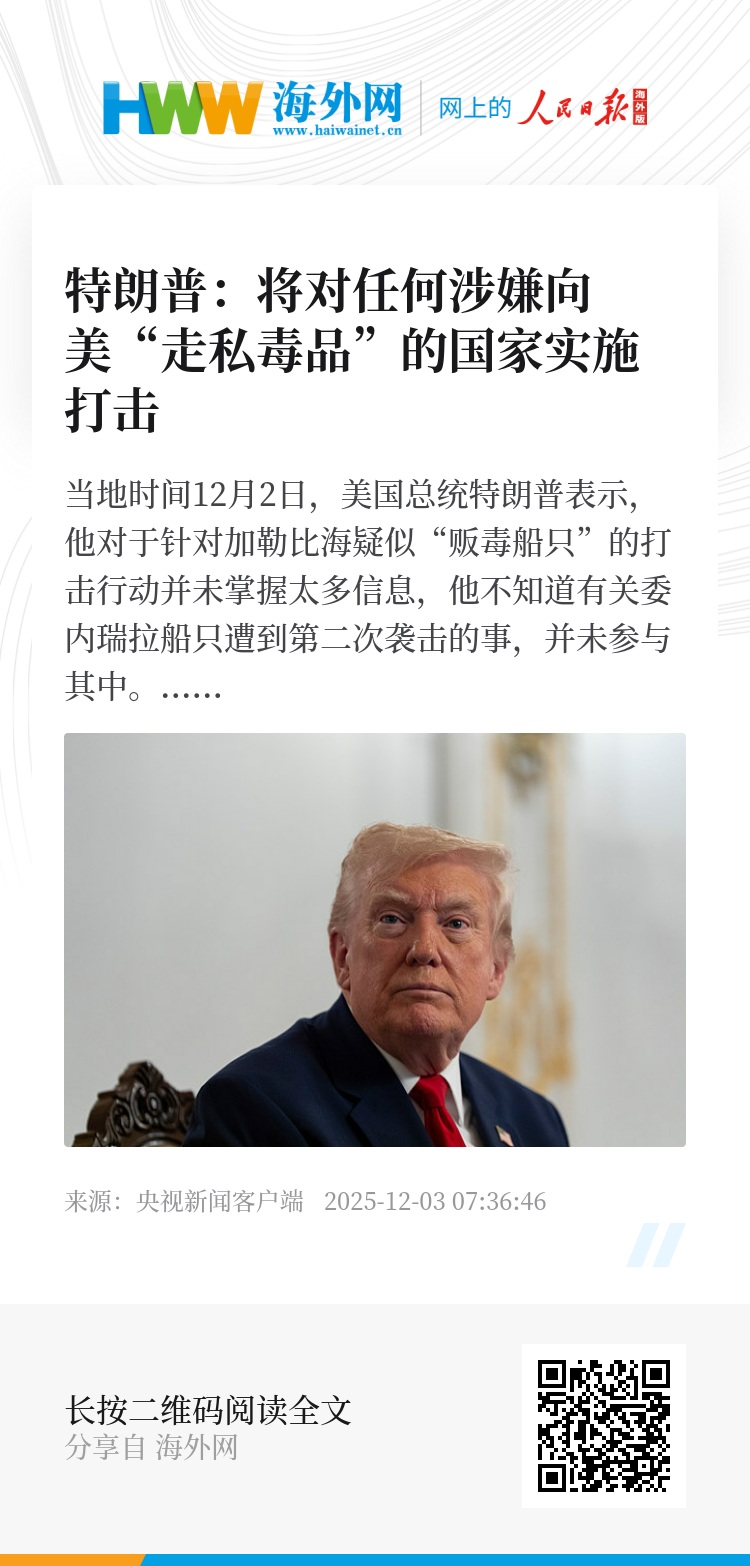 当地时间12月2日,美国总统特朗普表示,他对于针对加勒比海疑似“贩毒船只”的打击行动并未掌握太多信息,他不知道有关委内瑞拉船只遭到第二次袭击的事,并未参与其中。特朗普表示,美国战争部长(国防部长)赫格塞思必须就第二次袭击船只一事作出解释。