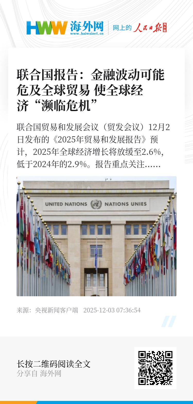 联合国贸易和发展会议(贸发会议)12月2日发布的《2025年贸易和发展报告》预计,2025年全球经济增长将放缓至2.6%,低于2024年的2.9%。报告重点关注了金融对贸易的影响,指出金融市场波动对全球贸易的影响力几乎与实体经济活动相当,并影响全球的发展前景。