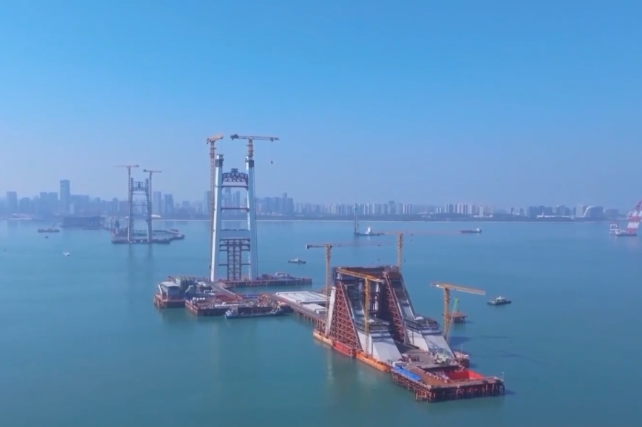 本次实现主塔封顶的刘五店航道桥全长1948米,主跨928米,主塔高178.1米,大桥单个主塔自下而上由60个钢壳节段和2道钢横梁组成,项目团队克服了全离岸海上超高结构施工、高精度钢壳节段拼装、大体积混凝土温控等系列高难度技术挑战。