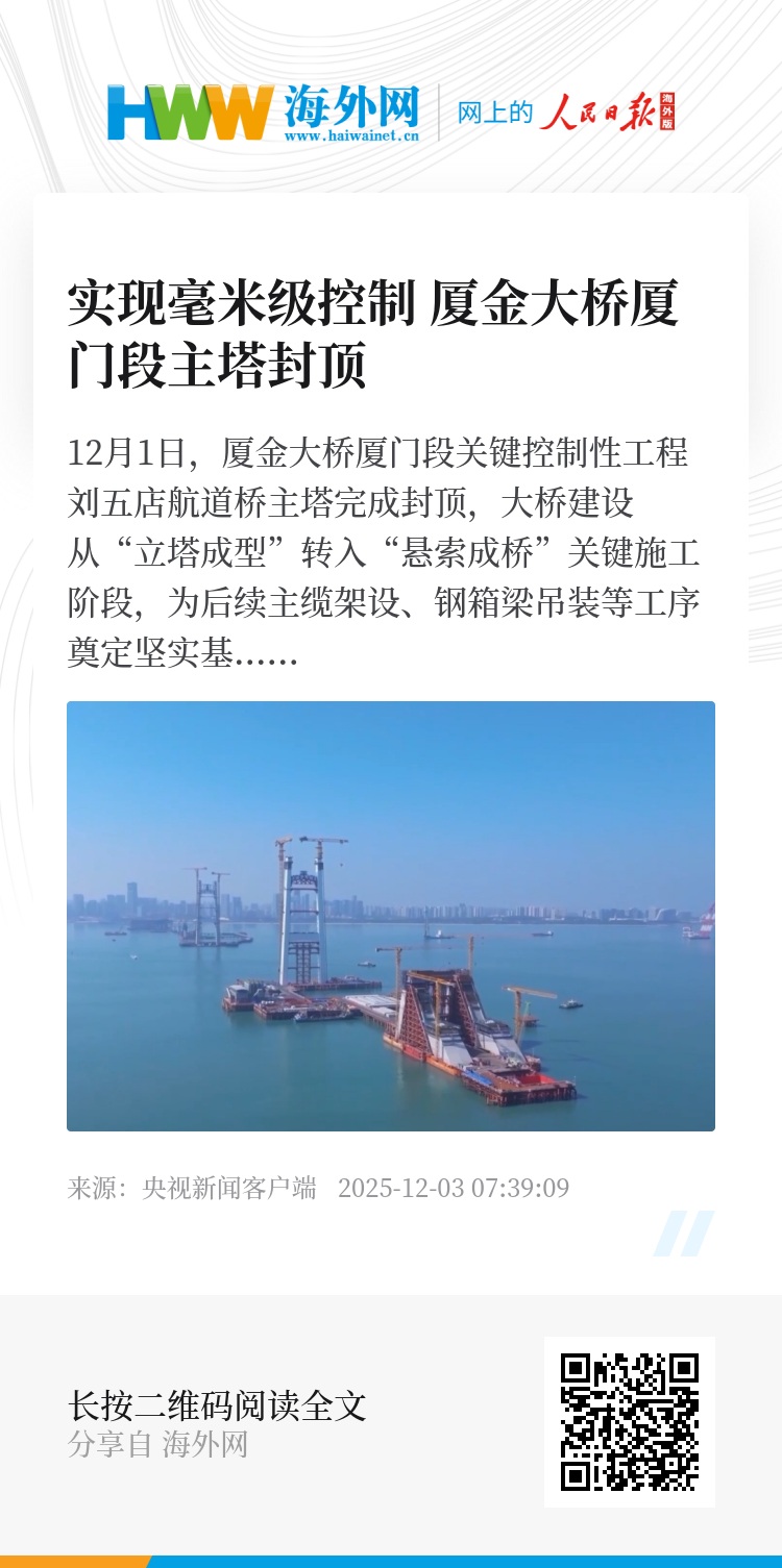 12月1日,厦金大桥厦门段关键控制性工程刘五店航道桥主塔完成封顶,大桥建设从“立塔成型”转入“悬索成桥”关键施工阶段,为后续主缆架设、钢箱梁吊装等工序奠定坚实基础。