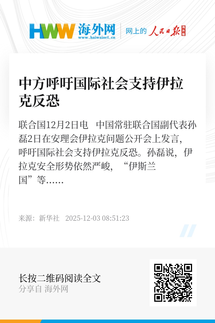 新华社联合国12月2日电 中国常驻联合国副代表孙磊2日在安理会伊拉克问题公开会上发言,呼吁国际社会支持伊拉克反恐。