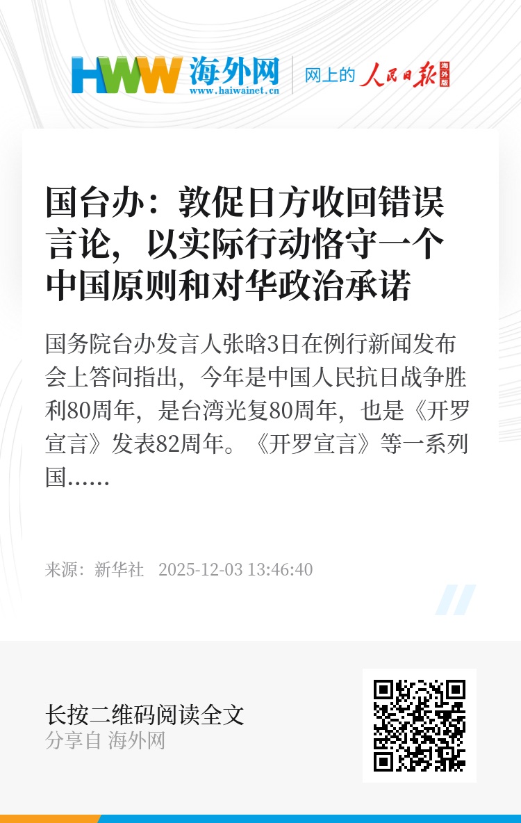 国务院台办发言人张晗3日在例行新闻发布会上答问指出,今年是中国人民抗日战争胜利80周年,是台湾光复80周年,也是《开罗宣言》发表82周年。《开罗宣言》等一系列国际法文件是世界反法西斯战争的重大成果,从国际法层面明确了中国对台湾的主权,更构成战后国际秩序的重要组成部分。遵守其有关规定是日方必须承担的国际法义务。