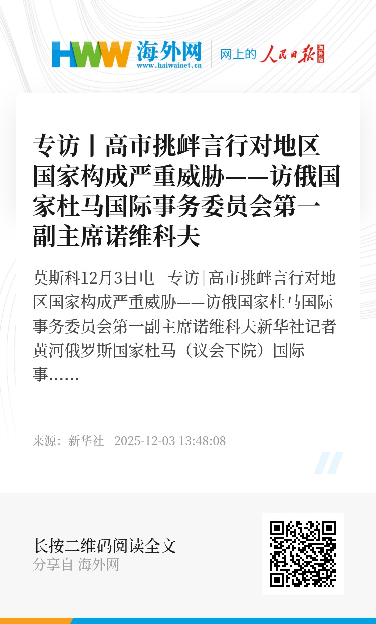 新华社莫斯科12月3日电 专访|高市挑衅言行对地区国家构成严重威胁——访俄国家杜马国际事务委员会第一副主席诺维科夫