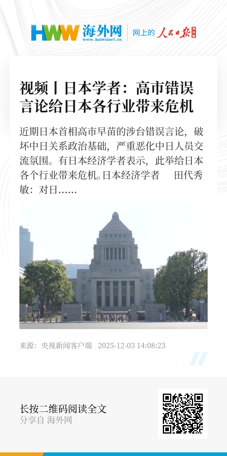 近期日本首相高市早苗的涉台错误言论,破坏中日关系政治基础,严重恶化中日人员交流氛围。有日本经济学者表示,此举给日本各个行业带来危机。