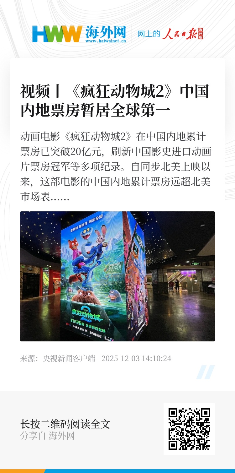 动画电影《疯狂动物城2》在中国内地累计票房已突破20亿元,刷新中国影史进口动画片票房冠军等多项纪录。自同步北美上映以来,这部电影的中国内地累计票房远超北美市场表现,成为该片全球最大的票房市场。
