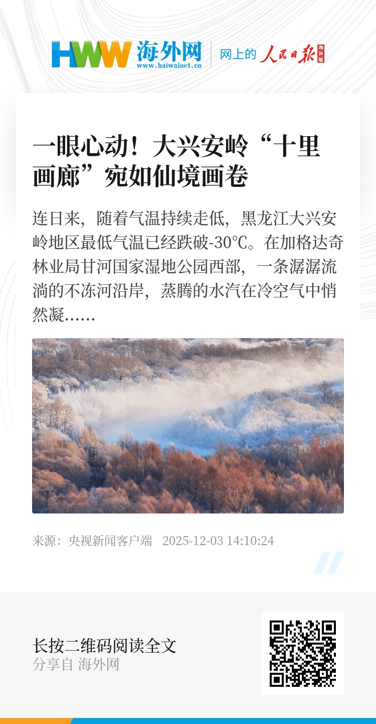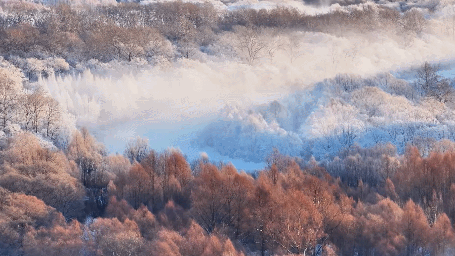 连日来,随着气温持续走低,黑龙江大兴安岭地区最低气温已经跌破-30℃。在加格达奇林业局甘河国家湿地公园西部,一条潺潺流淌的不冻河沿岸,蒸腾的水汽在冷空气中悄然凝华,为林木披上洁白盛装,形成了宛如仙境的“十里画廊”。该河段附近存在大量地热,因此河水在寒冬中也不会封冻。 (总台记者 李鑫 张安)