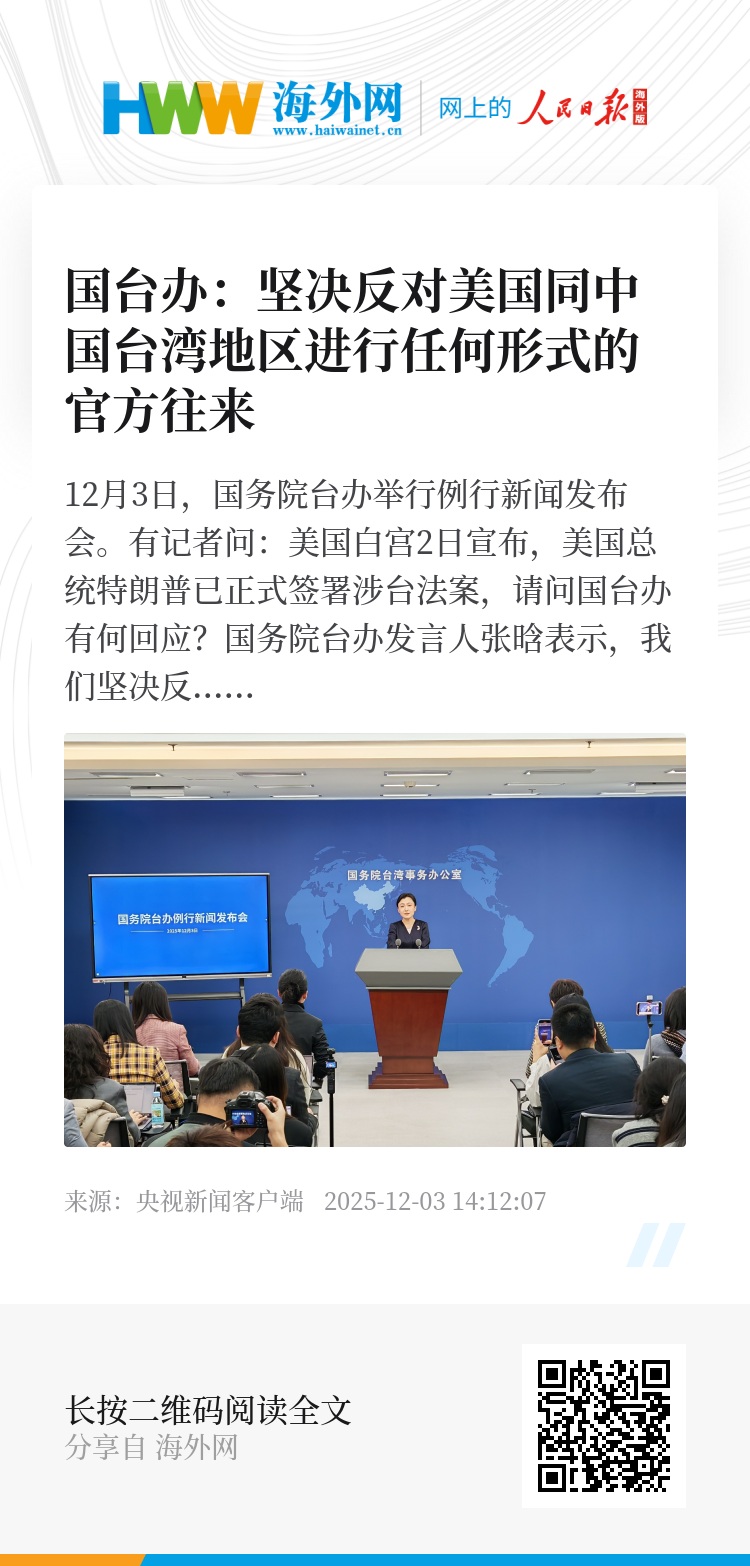 国务院台办发言人张晗表示,我们坚决反对美国同中国台湾地区进行任何形式的官方往来,这一立场也是一贯的、明确的。美方有关所谓的法案,粗暴干涉中国的内政,严重违反一个中国原则和中美三个联合公报规定的精神,向“台独”分裂势力发出了严重的错误信号,我们对此表示强烈不满和坚决反对,敦促美方恪守在台湾问题上所做的严肃政治承诺,不与台湾地区进行任何形式的官方接触。