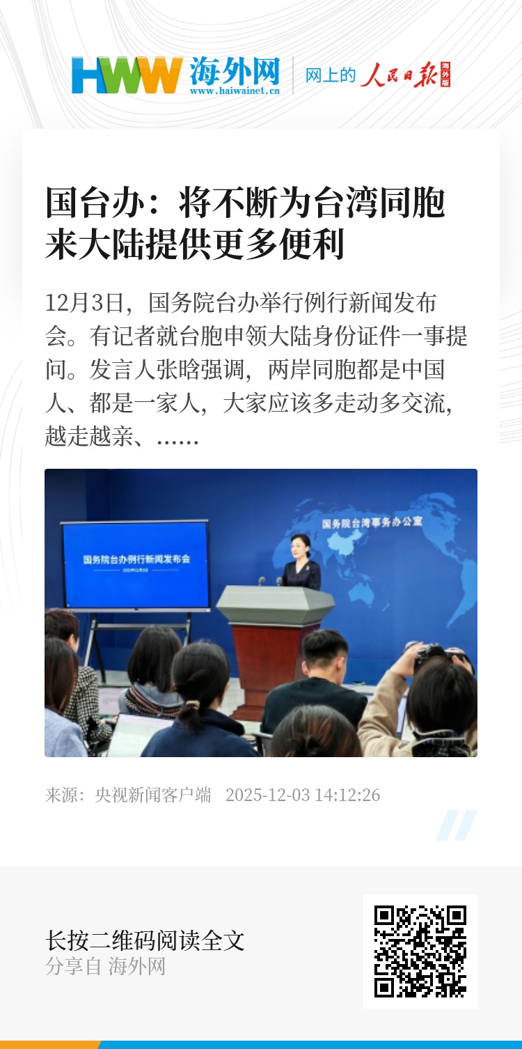 12月3日,国务院台办举行例行新闻发布会。有记者就台胞申领大陆身份证件一事提问。