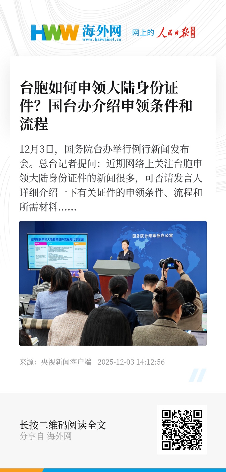 12月3日,国务院台办举行例行新闻发布会。总台记者提问:近期网络上关注台胞申领大陆身份证件的新闻很多,可否请发言人详细介绍一下有关证件的申领条件、流程和所需材料。