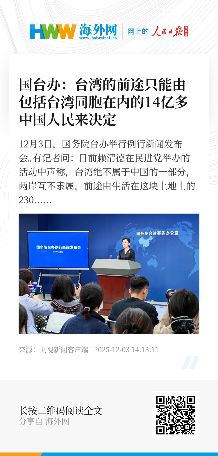 12月3日,国务院台办举行例行新闻发布会。有记者问: 日前赖清德在民进党举办的活动中声称,台湾绝不属于中国的一部分,两岸互不隶属,前途由生活在这块土地上的2300万人共同决定,请问发言人对此有何评论?