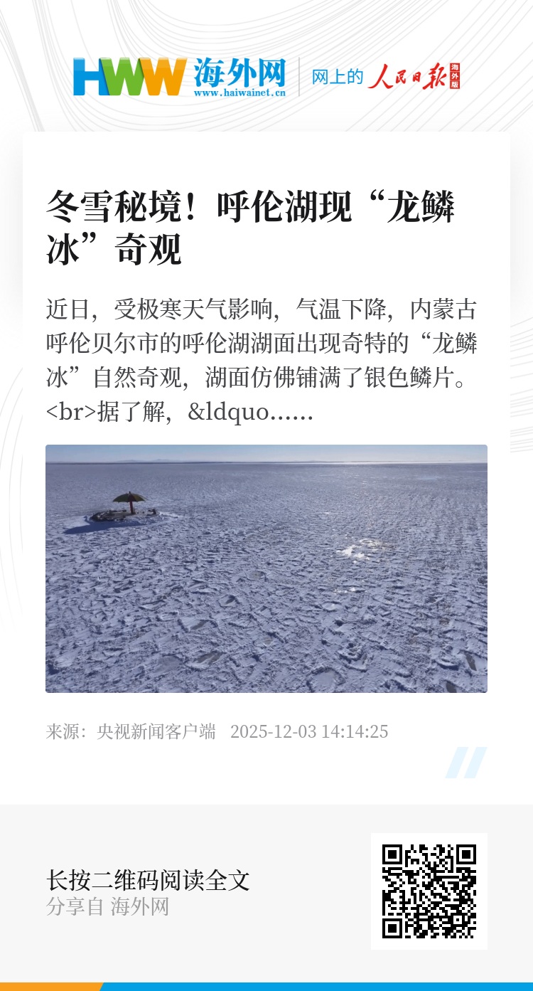 近日,受极寒天气影响,气温下降,内蒙古呼伦贝尔市的呼伦湖湖面出现奇特的“龙鳞冰”自然奇观,湖面仿佛铺满了银色鳞片。 据了解,“龙鳞冰” 的形成需要苛刻的气象条件。短时间的强降温使湖面开始结冰,但冰层尚未冻实;随后,在风力的驱动下,湖面流动的湖水推动这些未冻实的薄冰片,使其随风向层层堆叠排列。(总台记者 郑颖 薛东海 祁晓新)