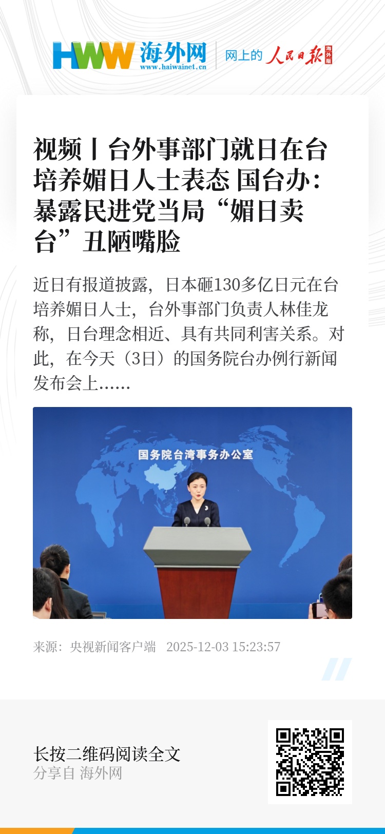 近日有报道披露,日本砸130多亿日元在台培养媚日人士,台外事部门负责人林佳龙称,日台理念相近、具有共同利害关系。对此,在今天(3日)的国务院台办例行新闻发布会上,发言人张晗指出,有关言论再度暴露民进党当局“媚日卖台”的丑陋嘴脸。