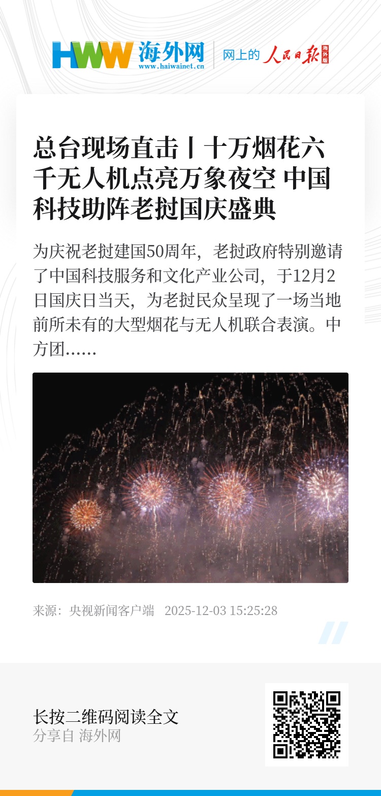 为庆祝老挝建国50周年,老挝政府特别邀请了中国科技服务和文化产业公司,于12月2日国庆日当天,为老挝民众呈现了一场当地前所未有的大型烟花与无人机联合表演。