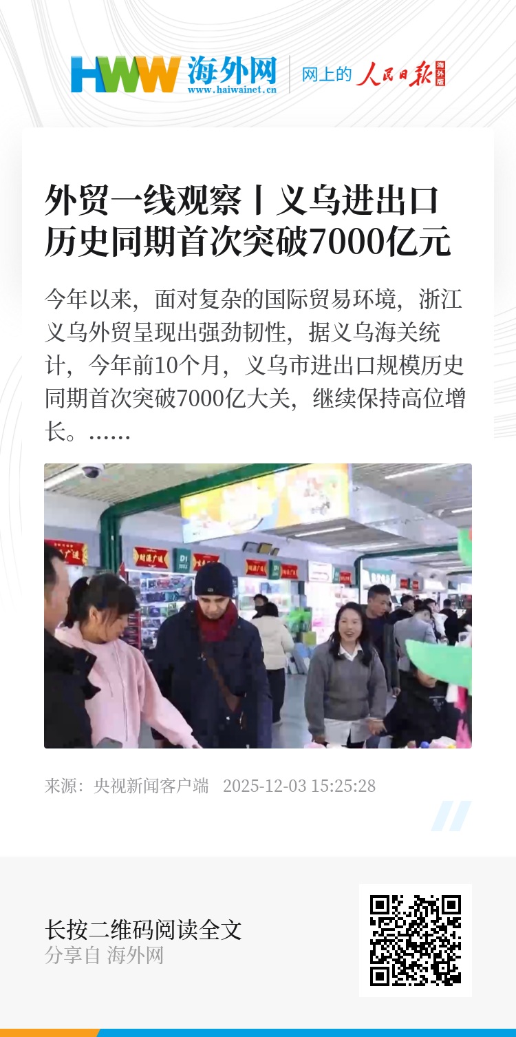 今年以来,面对复杂的国际贸易环境,浙江义乌外贸呈现出强劲韧性,据义乌海关统计,今年前10个月,义乌市进出口规模历史同期首次突破7000亿大关,继续保持高位增长。