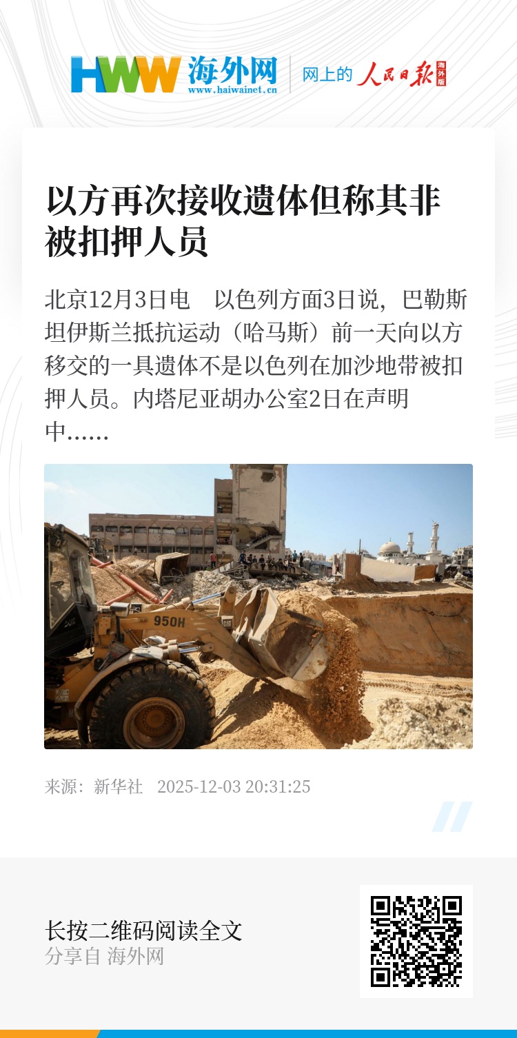 新华社北京12月3日电 以色列方面3日说,巴勒斯坦伊斯兰抵抗运动(哈马斯)前一天向以方移交的一具遗体不是以色列在加沙地带被扣押人员。