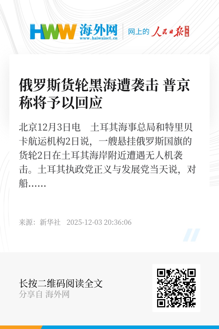 新华社北京12月3日电 土耳其海事总局和特里贝卡航运机构2日说,一艘悬挂俄罗斯国旗的货轮2日在土耳其海岸附近遭遇无人机袭击。土耳其执政党正义与发展党当天说,对船只的袭击不可接受。