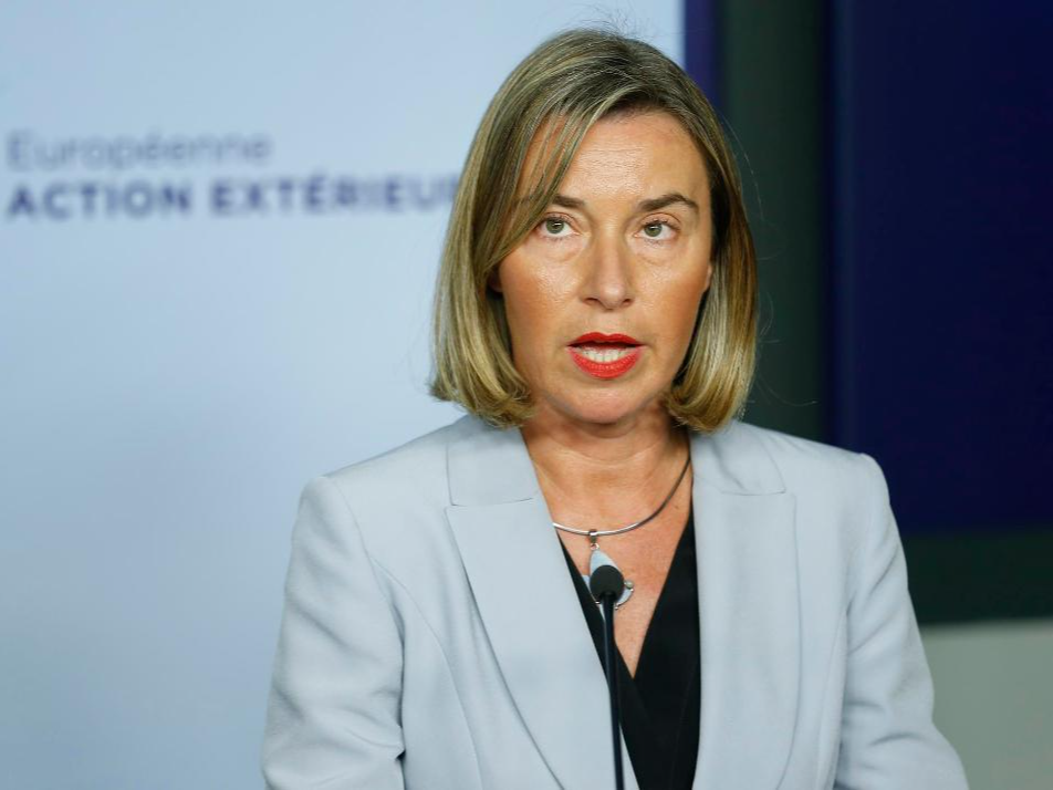 2018年1月11日,在比利时布鲁塞尔,时任欧盟外交和安全政策高级代表莫盖里尼在新闻发布会上讲话。新华社记者叶平凡摄