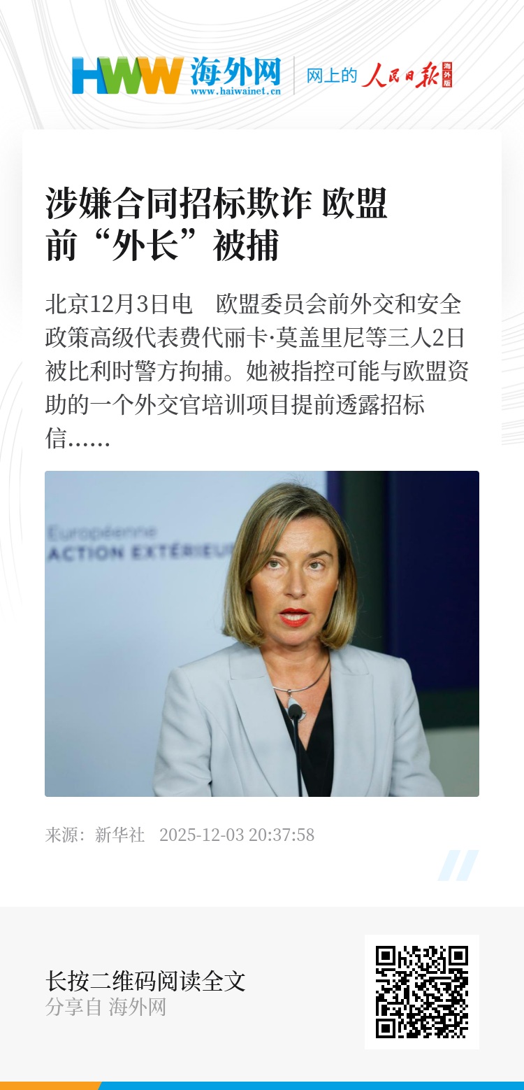 新华社北京12月3日电 欧盟委员会前外交和安全政策高级代表费代丽卡·莫盖里尼等三人2日被比利时警方拘捕。她被指控可能与欧盟资助的一个外交官培训项目提前透露招标信息有关。