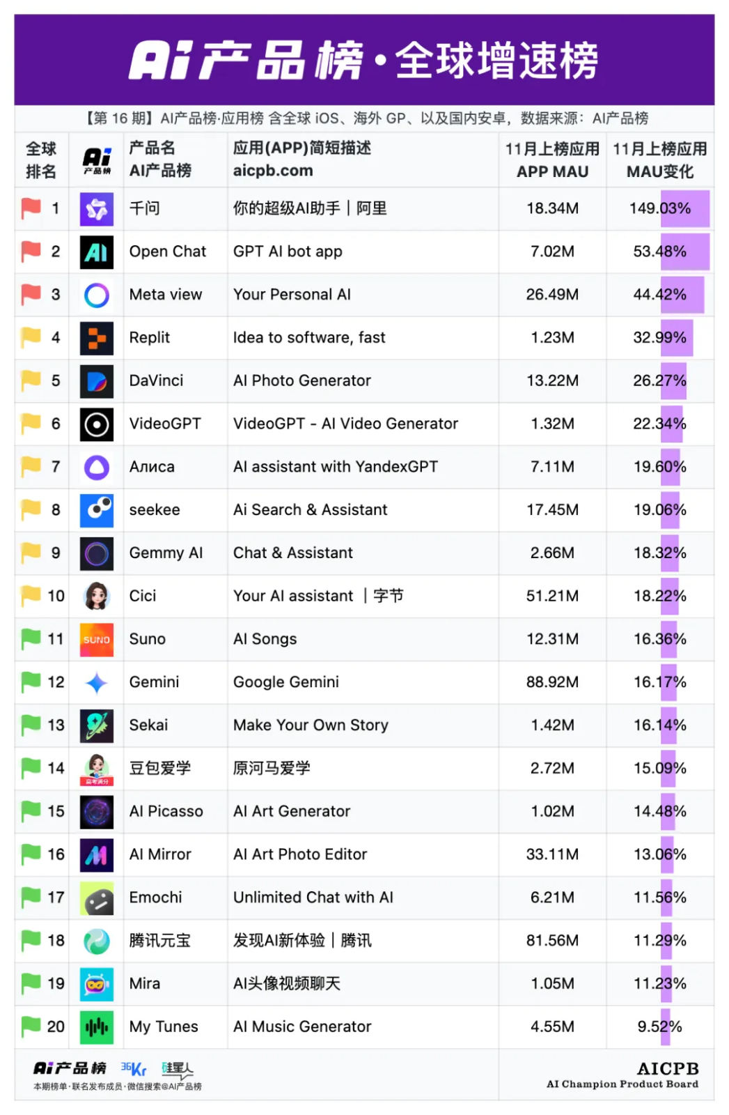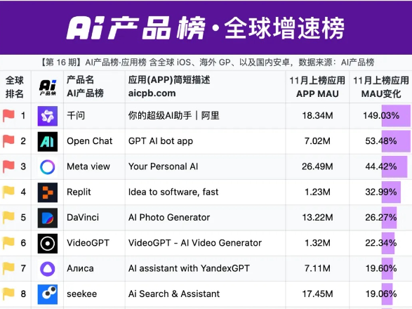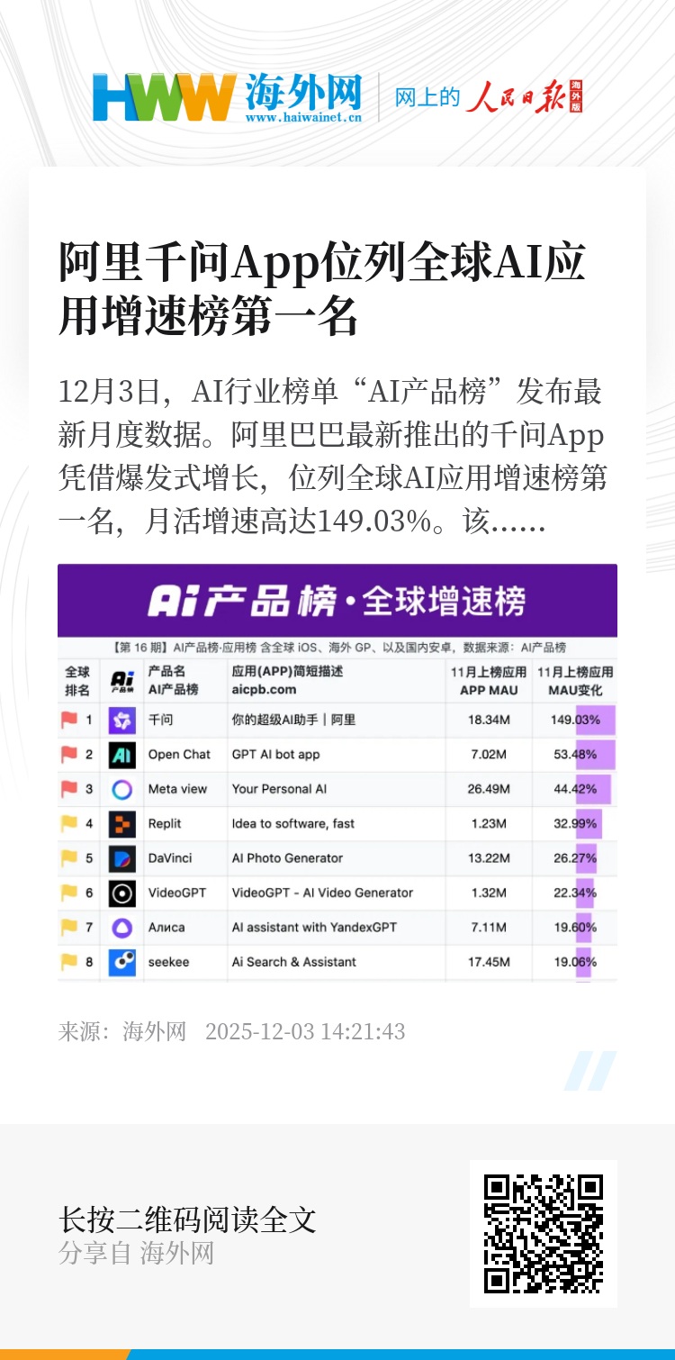 12月3日,AI行业榜单“AI产品榜”发布最新月度数据。阿里巴巴最新推出的千问App凭借爆发式增长,位列全球AI应用增速榜第一名,月活增速高达149.03%。该应用于11月17日开启公测,上线仅一周,下载量便突破1000万大关。
